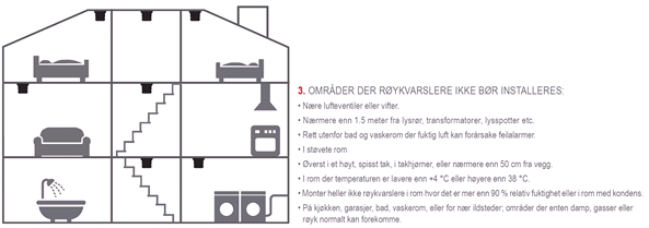 - Det anbefales røykvarsler i alle rom med lukkede dører. Kjøkken, vaskerom og teknisk rom bør ha varmevarsler.